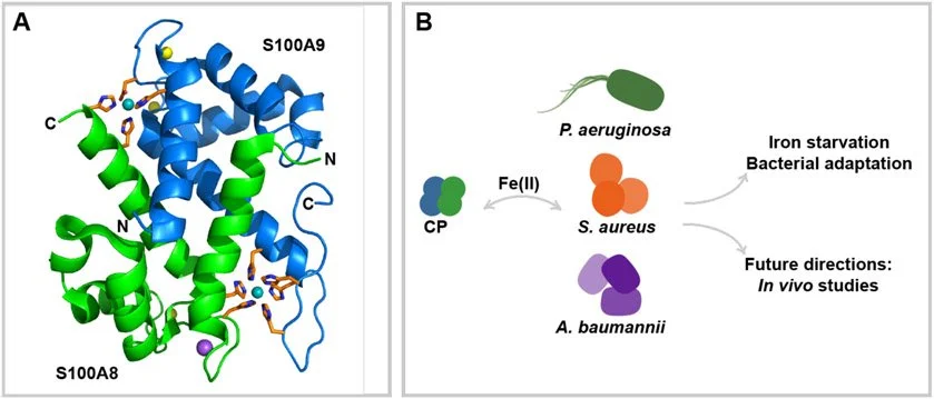 Ongoing collaborative studies with Dr. Elizabeth Nolan’s laboratory at MIT have examined the impact of calprotectin (CP) on P. aeruginosa iron homeostasis. Originally identified as the “CF antigen” due to its abundance in the lungs of CF patients, CP makes up >40% of the soluble protein in circulating neutrophils. When released from neutrophils, CP binds to several divalent transition metal ions, including zinc, manganese, and nickel to hinder microbial growth. In 2016, the Nolan laboratory made the landmark discovery that CP also bound to the reduced, ferrous form of iron. Subsequent work in collaboration with our laboratory demonstrated that CP induces a robust iron starvation response in P. aeruginosa. Collaborative work in the Nolan and Oglesby laboratories aims to determine how CP-dependent sequestration of multiple metal ions, including iron, affects the physiology and virulence trait expression by P. aeruginosa.
